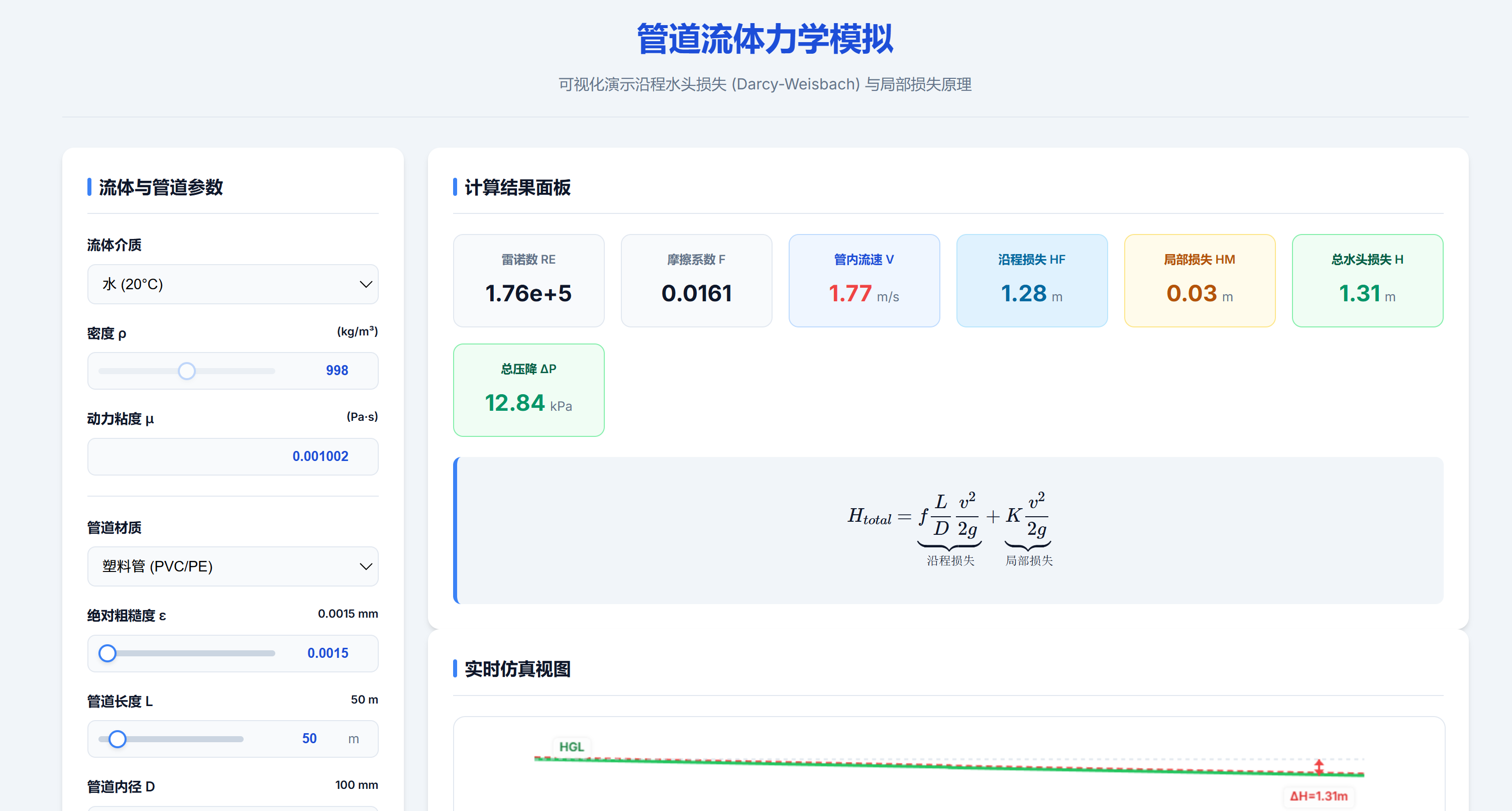 本平台是基于Darcy-Weisbach方程开发的流体力学交互式仿真工具,专为工程教育、科研分析和工业设计提供直观的水头损失计算与可视化演示。用户可通过调整流体类型、管道参数、局部构件等变量,实时观察沿程阻力、局部阻力的变化规律,并生成完整的压降与能量损失数据。