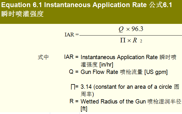 对于站点式喷枪,可使用方程式6.1计算瞬时喷灌强度(IAR):
