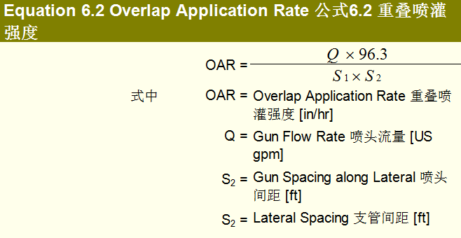 对于站点式喷枪,重叠喷灌强度(OAR)用于确定所有灌溉装置完成后(整个农田被灌溉后)施加到土壤上的总水量。它将用于确定最大灌溉间隔(周期)。使用喷枪间距和流量可计算重叠应喷灌强度,如等式6.2 所示: