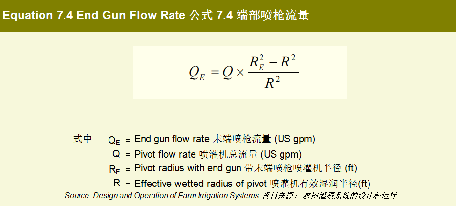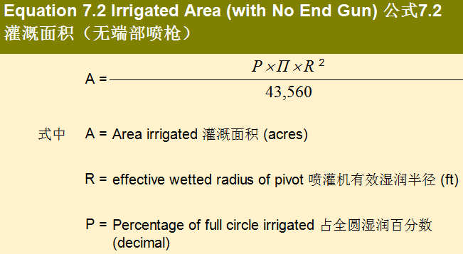 计算喷灌机支管减去端枪的灌溉面积(公式7.2)。该区域用于确定支轴喷灌机流量。