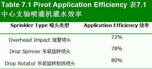 | Table 7.3 Amount Applied per Day by Centre Pivot Systems (inches) (Rotation Time (N) = 24 hr) 表7.3 中心支轴喷灌机系统每天的应用量(英寸)(旋转时间(N)=24小时) | ||||||||||||